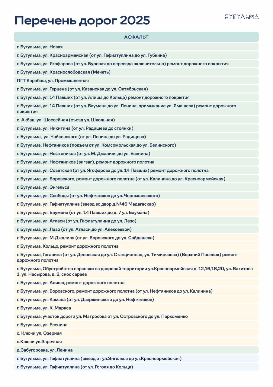 Участки бугульминских дорог и улицы, которые обновят в 2025 году, назвал руководитель местного исполкома Дамир Фаттахов. Соответствующий перечень он опубликовал в своем телеграм-канале. При этом чиновник признал, что пока процент изношенности улично-дорожной сети в Бугульминском районе очень высок.