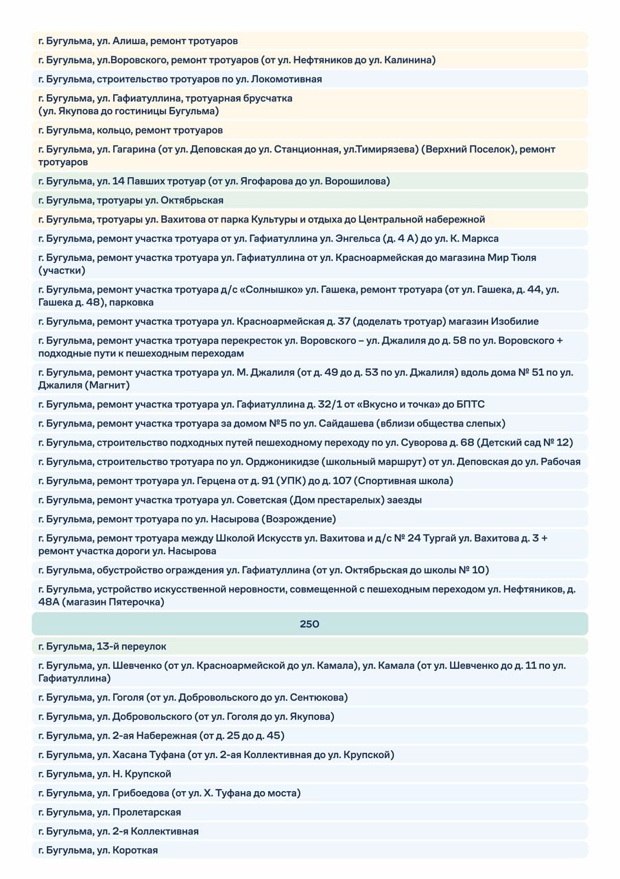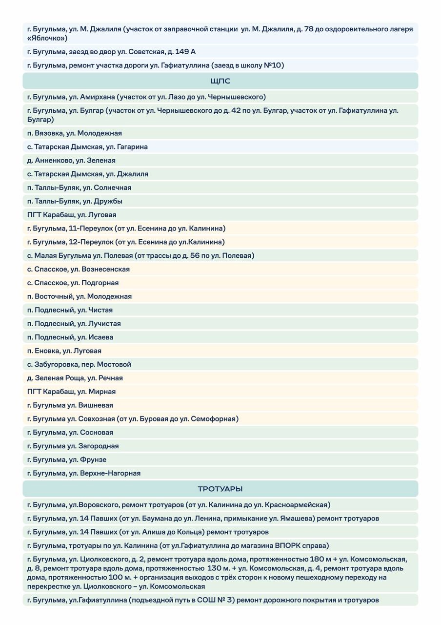 «Такого уровня поддержки у нас еще никогда не было. И это только начало. Мы уже начали формировать программу на следующий год. Все ваши обращения, предложения и наши совместные обходы обязательно будут учтены. Шаг за шагом мы приведем в порядок дороги, улицы и тротуары — так, чтобы через несколько лет у Бугульмы и района появилась качественно новая дорожная сеть, которая будет создавать должное качество жизни», — поделился он.