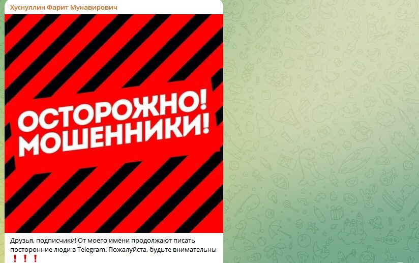 — Друзья, подписчики! От моего имени продолжают писать посторонние люди в Telegram. Пожалуйста, будьте внимательны, — предупредил Хуснуллин.