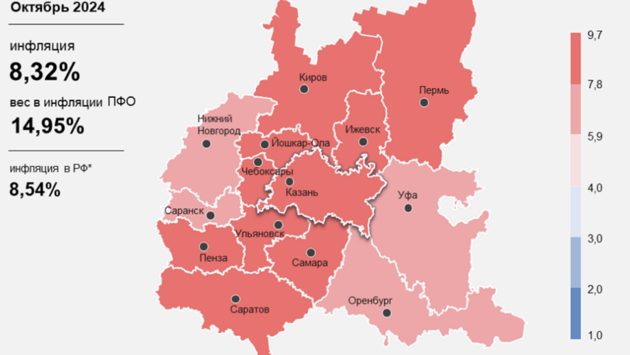 Годовая инфляция в Татарстане в октябре 2024 года снизилась и составила 8,32%. Это связывают с увеличением предложения некоторых товаров и услуг, а также с эффектом высокой сравнительной базы прошлого года. Уровень инфляции в регионе стал выше, чем в ПФО, но ниже, чем в России, сообщает пресс-служба Банка России.