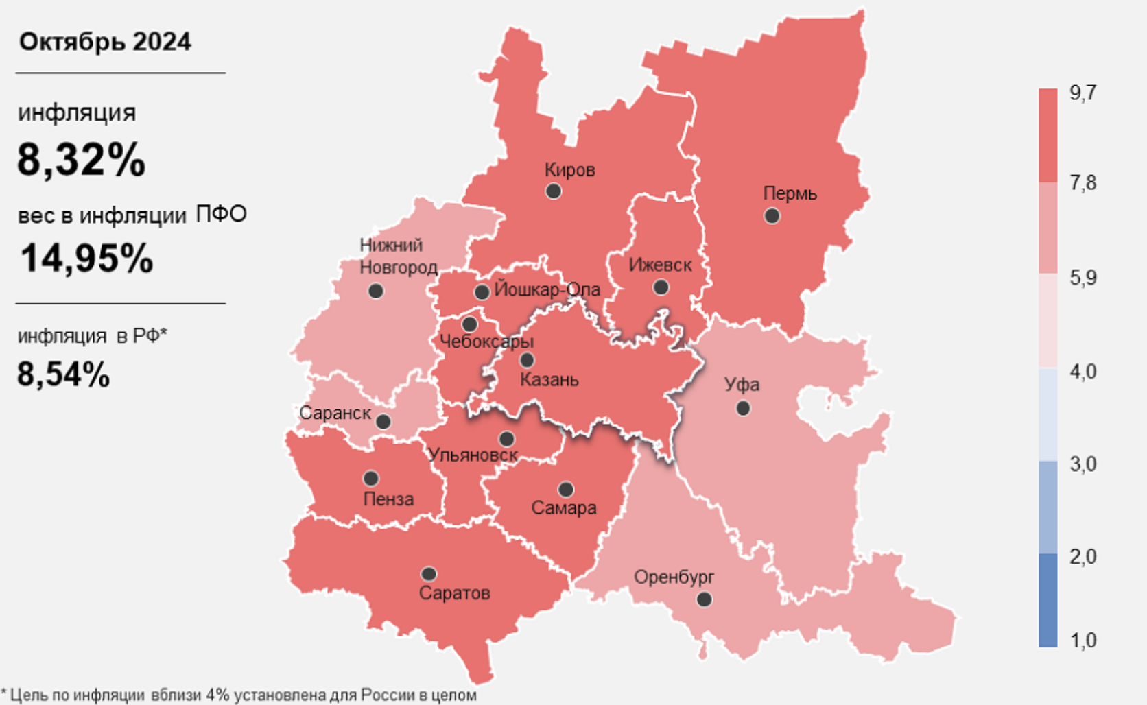 Годовая инфляция в Татарстане в октябре 2024 года снизилась и составила 8,32%. Это связывают с увеличением предложения некоторых товаров и услуг, а также с эффектом высокой сравнительной базы прошлого года. Уровень инфляции в регионе стал выше, чем в ПФО, но ниже, чем в России, сообщает пресс-служба Банка России.