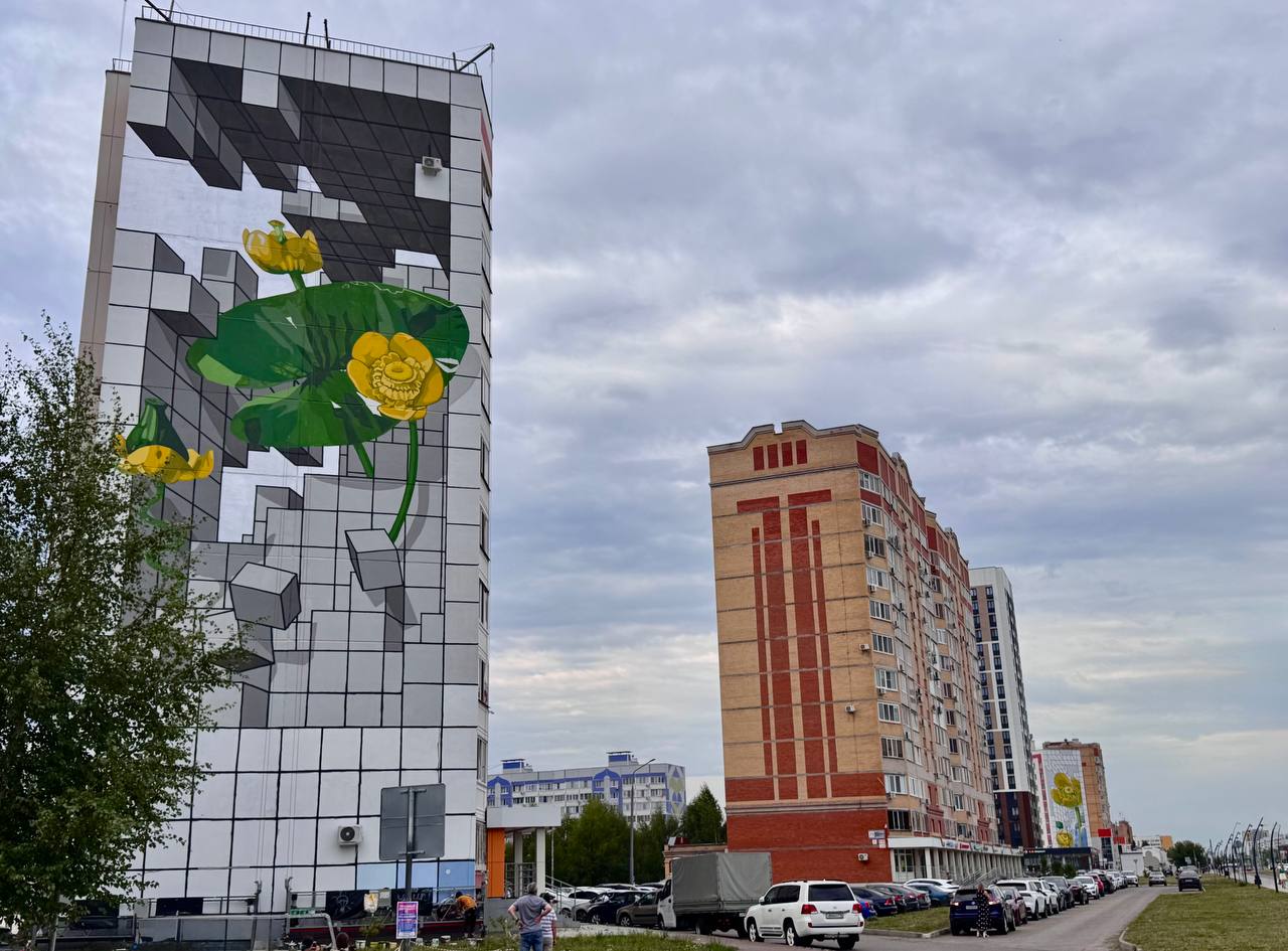 Основной мотив масштабной серии муралов – кубики, символизирующие строительство города. Это отсылка к тому, как поэтапно создавался Нижнекамск: сначала появлялись временные вагончики, затем – жилые кварталы, школы, промышленные объекты. Город буквально собирался «по частям», словно из конструктора.