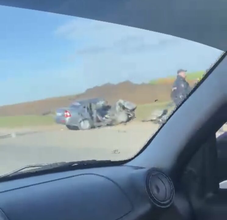 На кадрах видно, что на обочине стоит искореженная легковушка «Лада». У машины разбита вся передняя часть, видно, что удар был лоб в лоб. Рядом с искореженным автомобилем лежит тело человека — неизвестно, жив он или нет.