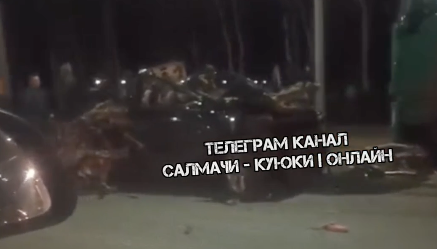 В результате аварии легковушка превратилась в груду металла. На кадрах видно, что детали автомобиля разлетелись по дороге. Предположительно, он врезался в большегруз.