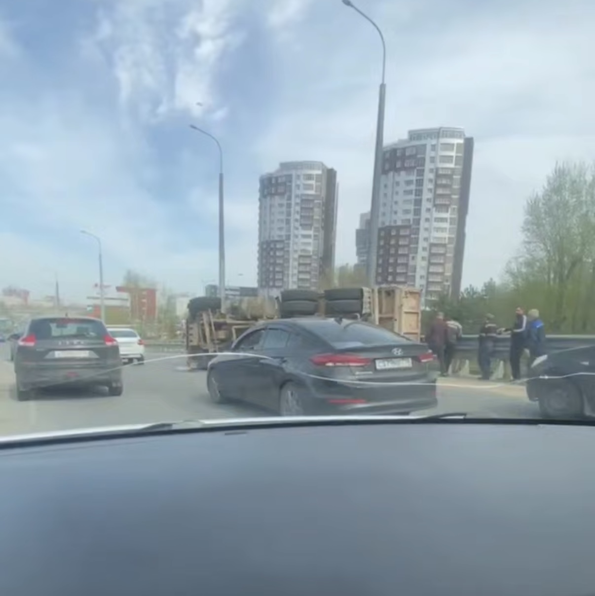 На кадрах видно, как большегруз на скорости входит в поворот. Однако шоферу не удается удержать многотонник на дороге и он заваливается на бок.