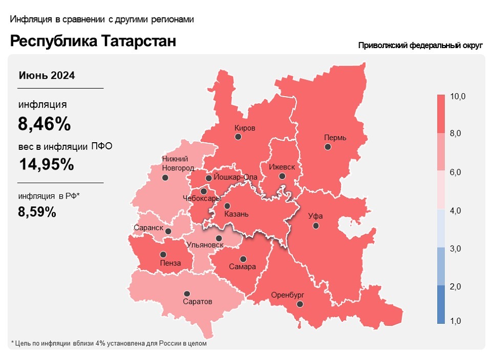 Уровень инфляции в Татарстане вырос с майских показателей 8,43% до июньских показателей 8,46%. Об этом сообщили в Центральном Банке России. Кроме того стоит отметить медленный рост инфляции, за месяц он составил всего 0,3%.