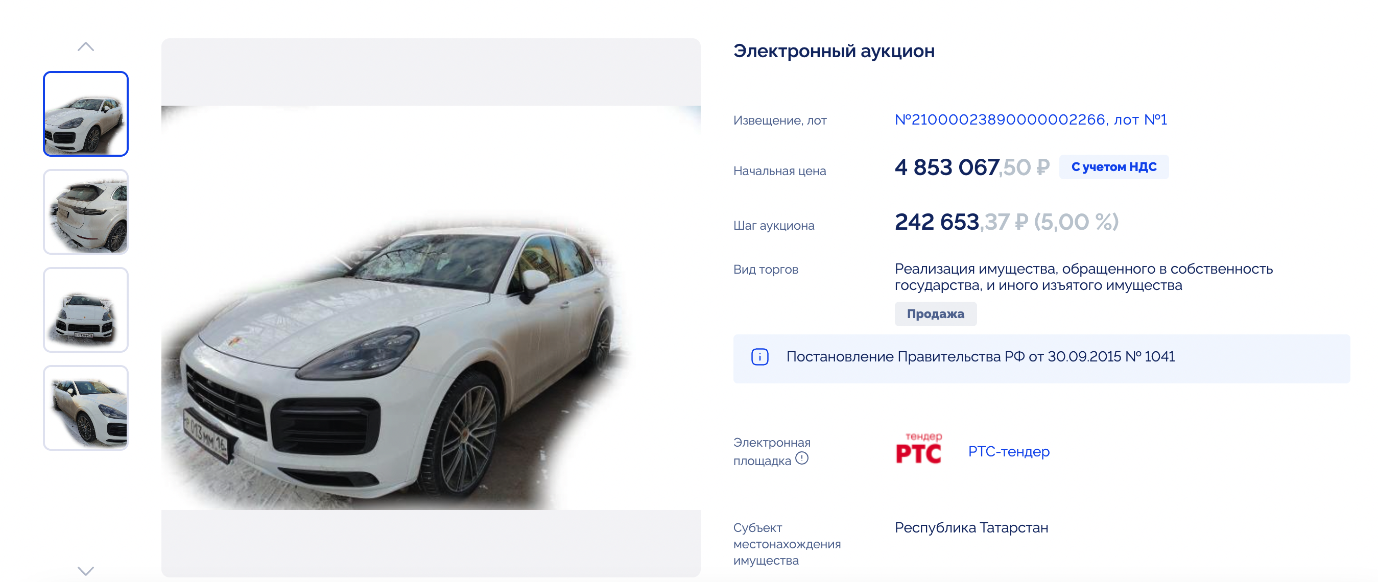 На электронные торги выставили автомобиль Porsche Cayenne за 4,85 миллиона рублей. Аукцион открыли на государственном портале Torgi.gov.ru. В качестве местонахождения автомобиля указана Республика Татарстан, город Бугульма.