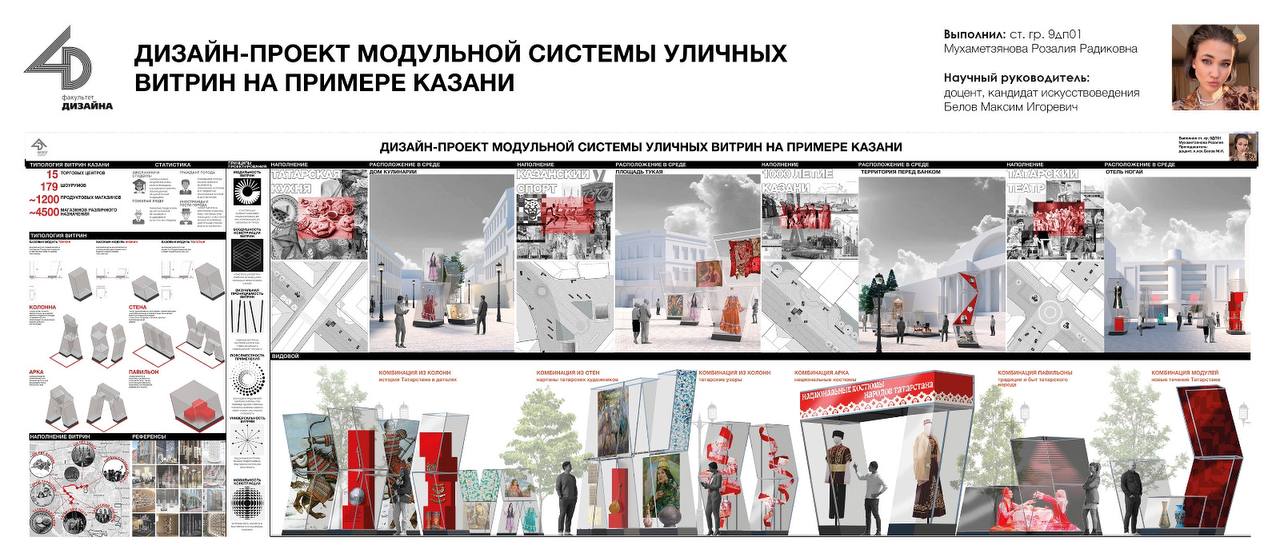 Дизайн-проект модульной системы уличных витрин на примере Казани также был предложен на защите. Выпускница инициировала создание объектов нестандартной формы. Изогнутые конструкции, прозрачные блоки и подсветка — из этих частиц собирается уличная архитектура города, предложенная студенткой.