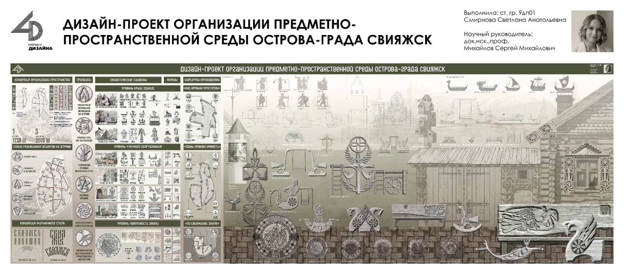Еще один дизайн-проект коснулся организации предметно-пространственной среды острова-града Свияжск. В проекте представлены детали в народном стиле. Среди объектов — плакаты, скамейки, маленькие детали, украшающие здания.