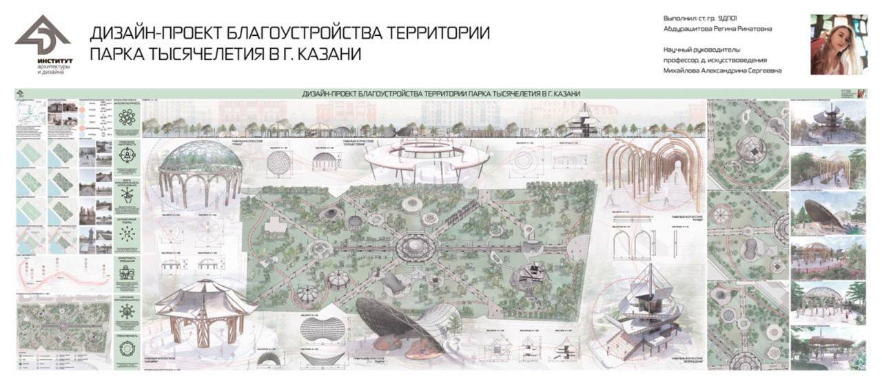 Один из необычных проектов коснулся благоустройства территории парка Тысячелетия в Казани. Основным объектом в проекте выступает пергола — строение, состоящее из навеса и столбов, на котором он держится. Студентка предложила несколько вариантов крыши: в форме сферы и спирали. Также было предложено установить арки на территории одного из популярнейших мест Казани.