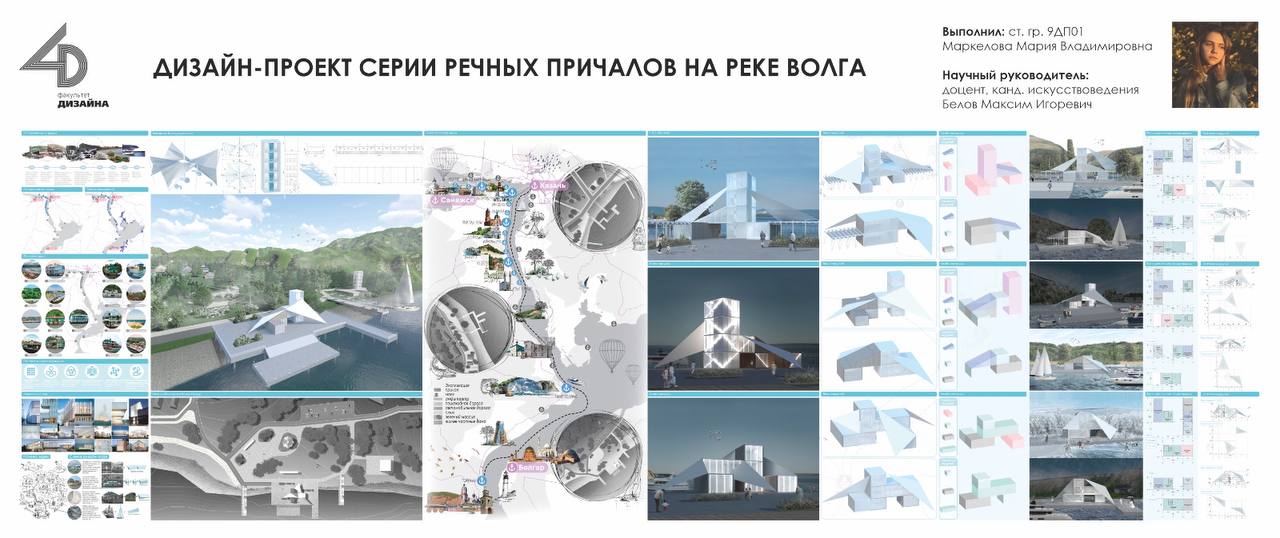 Речные причалы на Волге также могут преобразиться. Студентка предложила установить их вдоль береговой линии. Причалы состоят из прозрачных навесов с подсветкой.