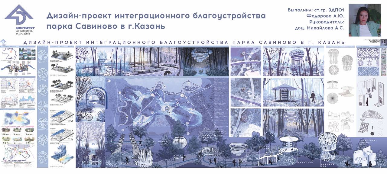 Также появился проект интеграционного благоустройства парка Савиново. Как и один из других проектов, он выполнен в современных синих и фиолетовых оттенках. В нем могут появиться необычные арт-объекты и фонтаны.