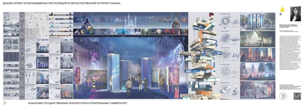 Выпускники предложили благоустроить семь казанских территорий. Среди них оказался Музей естественной истории, проект которого выполнен в современных синих оттенках. Будущий архитектор предложил создать мультимедийные инсталляции на базе этого заведения — стенды с подсветкой.
