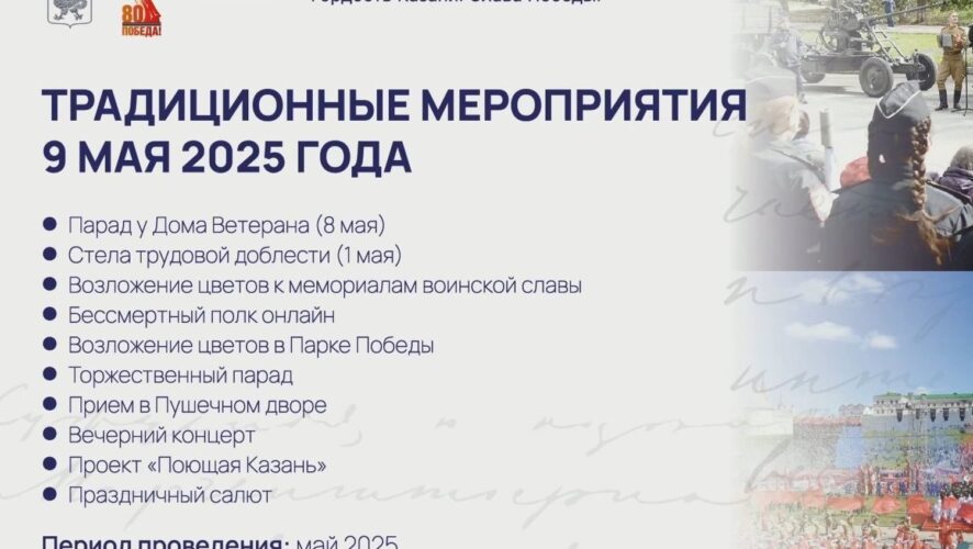 Празднование 9 Мая в Казани пройдет под слоганом «Гордость Казани. Слава Победы», сообщили в мэрии города. В этот день у стен Казанского кремля на площади Тысячелетия состоится торжественный парад, а также многочисленные памятные мероприятия.