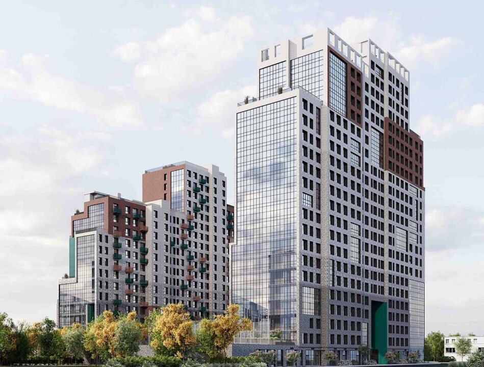 Современный комплекс состоит из двух высотных домов переменной этажности, соединенных общим стилобатом. В проекте предусмотрена мультизональная система кондиционирования и инженерное оборудование, которое тщательно спрятали на кровле. Преследуя цель создать комфорт и безопасность для жителей, ЖК спроектировали с учетом принципов «безбарьерной среды» и «двор без машин». Для автовладельцев, в том числе электрокаров, предусмотрели подземный этаж и открытые парковочные места.