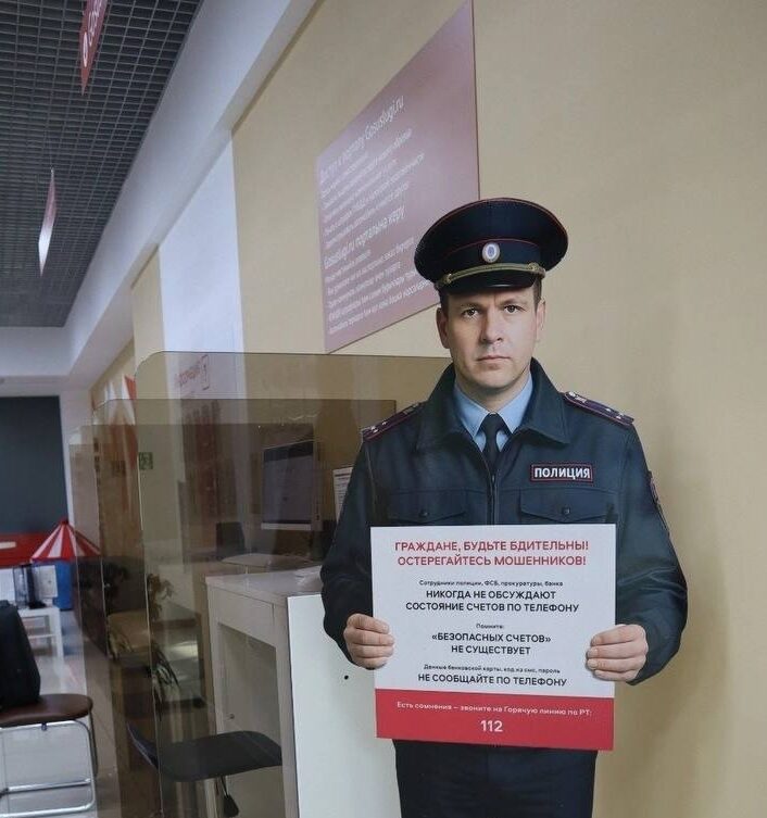 В Нижнекамске для борьбы с телефонными мошенниками в МФЦ и Социальном фонде России появились макеты полицейских. Эти фигурки выполнены так, чтобы их взгляд всегда был направлен на каждого посетителя. Основная цель таких установок — напоминание горожанам о мерах предосторожности при общении с мошенниками, особенно в моменты, когда они могут попасть в ловушку аферистов.