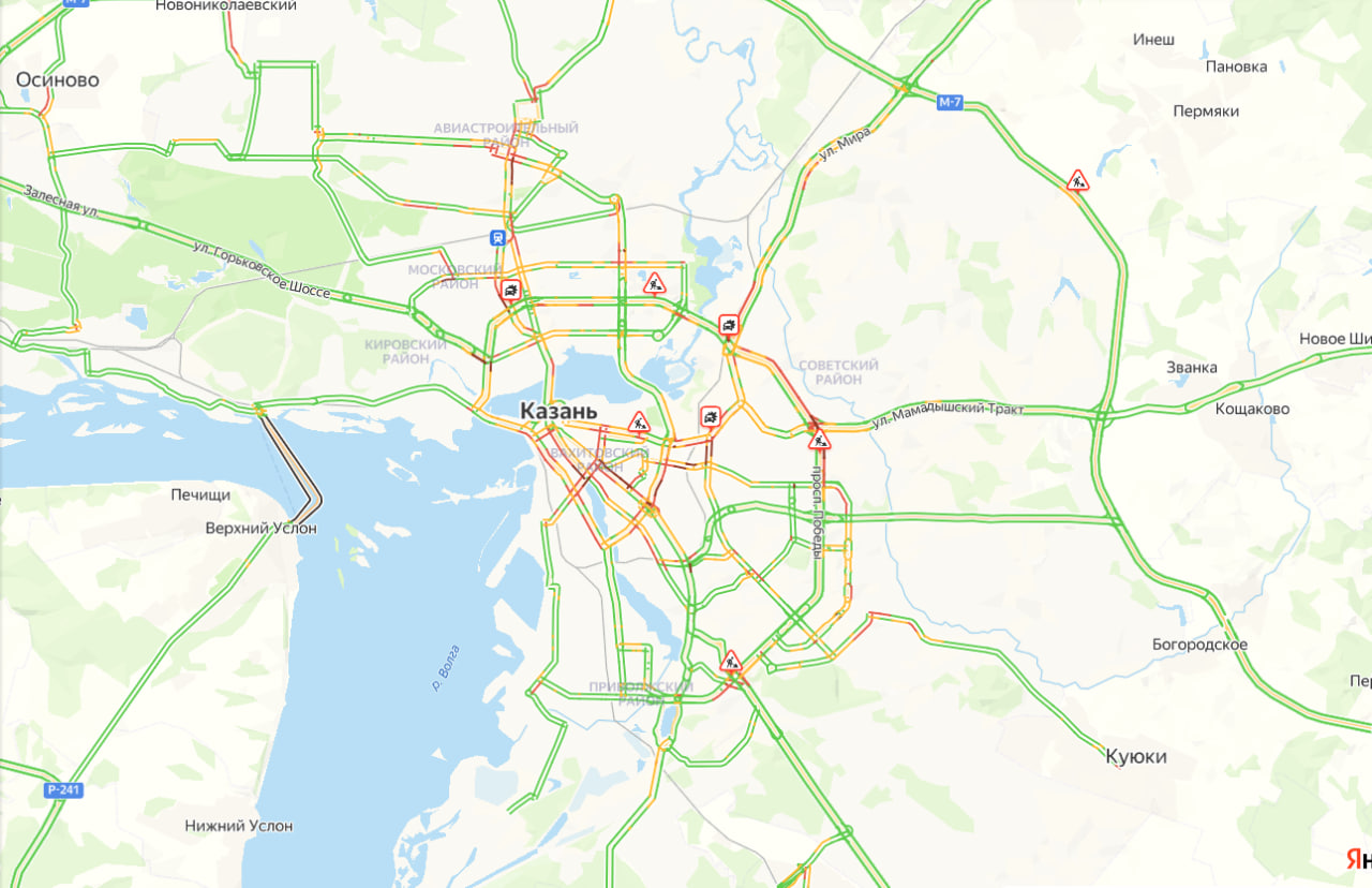 Самое большое скопление машин пришлось на Вахитовский и Советский районы. Также движение парализовано в Авиастроительном и Московском районах. На данный момент пробки не коснулись Приволжского и Кировского районов.
