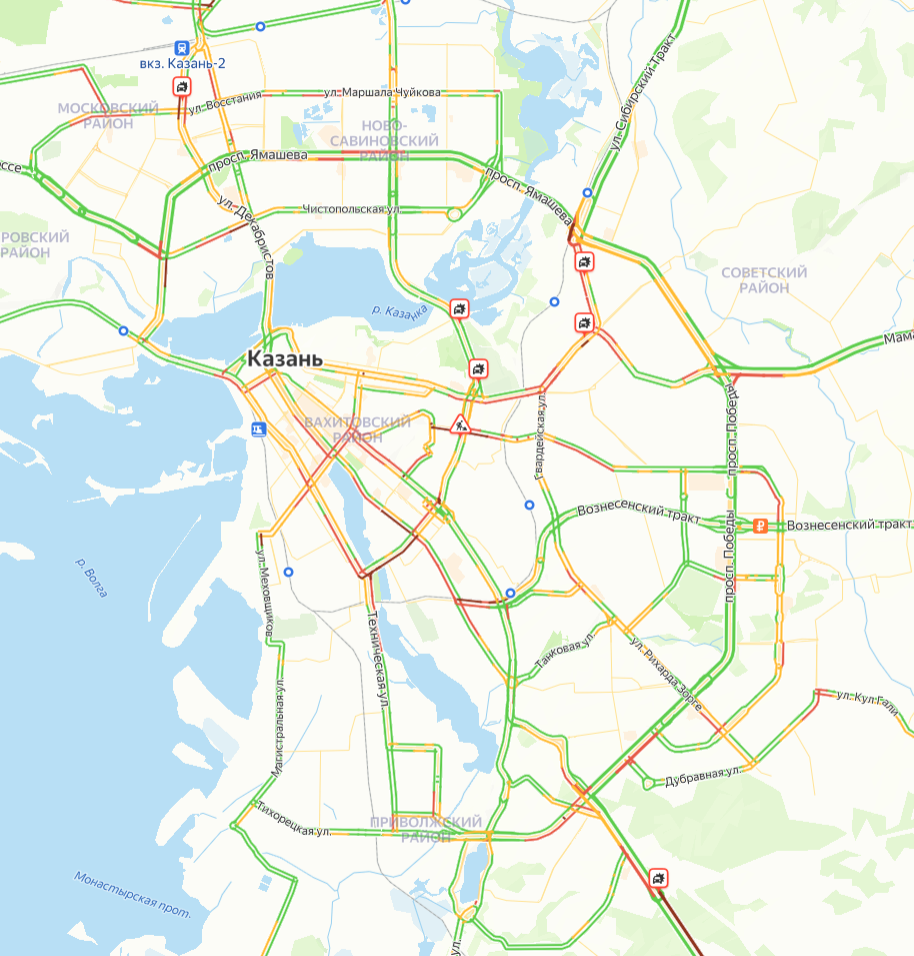 Наиболее сложная ситуация наблюдается на проспекте Ямашева, где образовался серьезный затор. Также значительные заторы зафиксированы на улице Чистопольской, проспекте Победы и в районе улицы Вознесенский тракт.