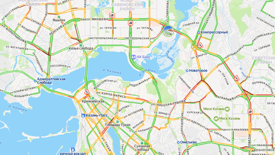 Сегодня в Казани уровень пробок достиг 9 баллов, согласно данным «Яндекс.Карты». Основной причиной затруднений на дорогах стали неблагоприятные погодные условия.