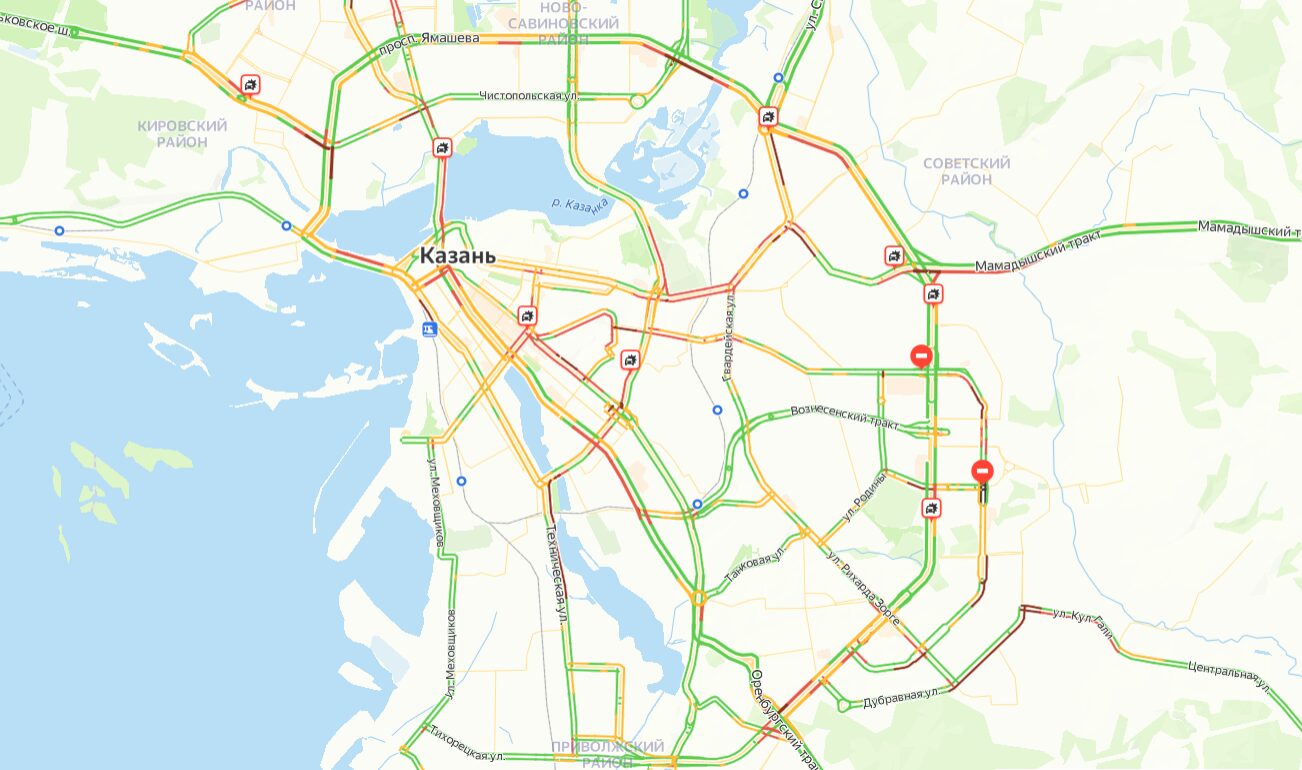 Также парализованы Мамадышский тракт, Ершова, проспект Ямашева, Кремлевская дамба. Бордовым окрасились улицы Большая Крыловка, Саид-Галеева, Достоевского, Островского, Техническая.