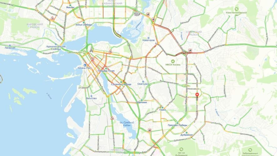 Бордовым окрасился центр Казани. Сейчас движение затруднено на улицах Салимджанова, Тихомирнова, Вишневского, Право-Булачной, Лево-Булачной, Дзержинского. Заторы наблюдаются на развязке у Мамадышского тракта, улице Габишева.