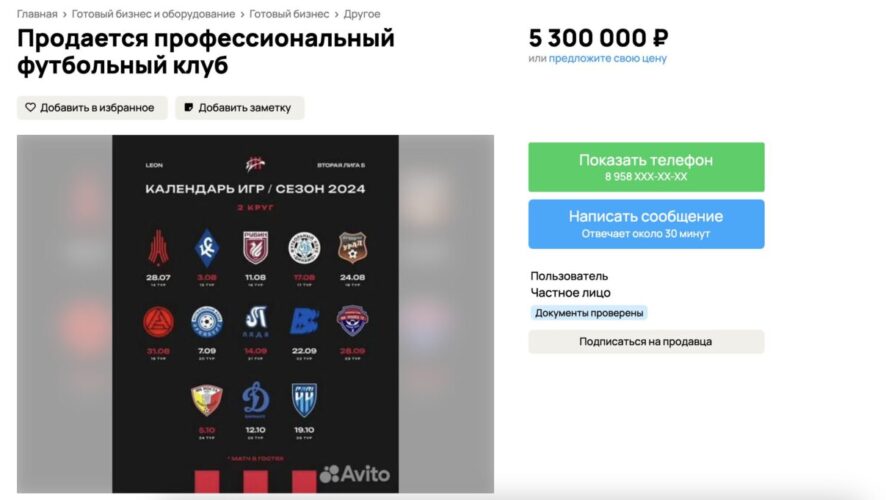 Кроме того, в объявлении указано, что клуб можно приобрести без долгов по зарплате для сотрудников, без обременения. В клубе есть два взрослых собственника. Экипировку и инвентарь отдают даром.