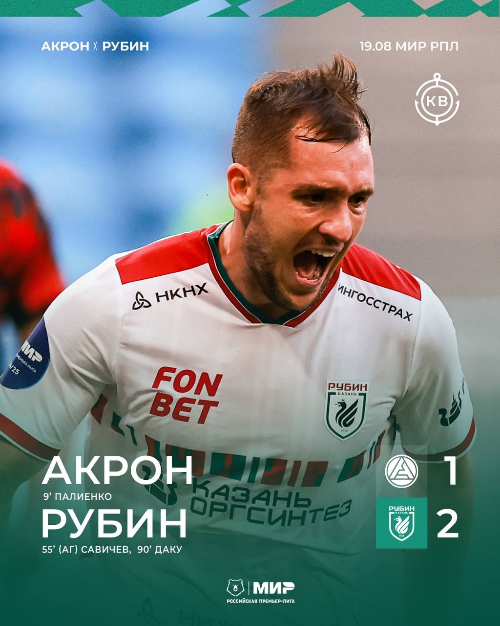 В пятом туре матча чемпионата России казанский «Рубин» одержал волевую победу над «Акроном» из Тольятти со счетом 2:1. Об этом команда сообщила в своем телеграм-канале.