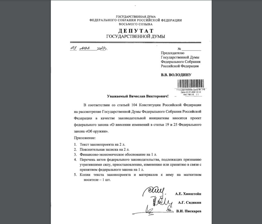Депутаты от партии «Единая Россия» внесли в Госдуму законопроект, который позволит передавать конфискованное и невостребованное оружие в зону СВО. В своих социальных сетях об этом написал Александр Хинштейн. С полным содержанием законопроекта можно ознакомиться по ссылке https://sozd.duma.gov.ru/bill/617801-8