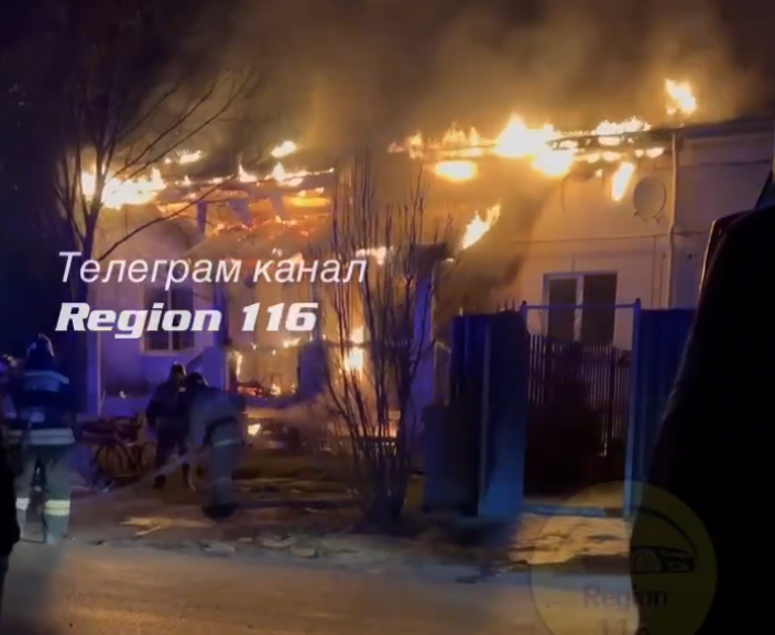 На опубликованных в социальных сетях кадрах видно, как пожарные борются с огнем, который уже успел частично уничтожить кровлю здания. Пламя охватило крышу дома целиком.