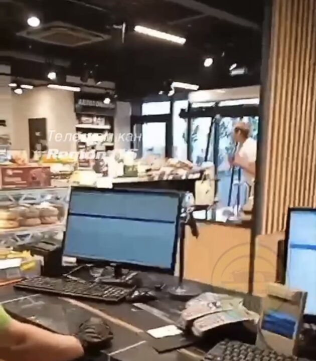 На кадрах видно, как дебошир хватает с полок все подряд и кидает в стену. После он бросает на пол и портит продукты и воду.