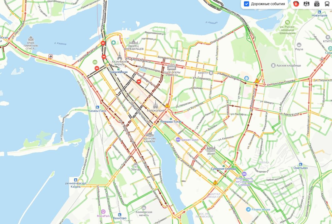 Сегодня центр Казани оказался парализован 9-балльными пробками. Сервис «Яндекс.Карты» и очевидцы подтверждают серьезные затруднения в движении на центральных улицах города.