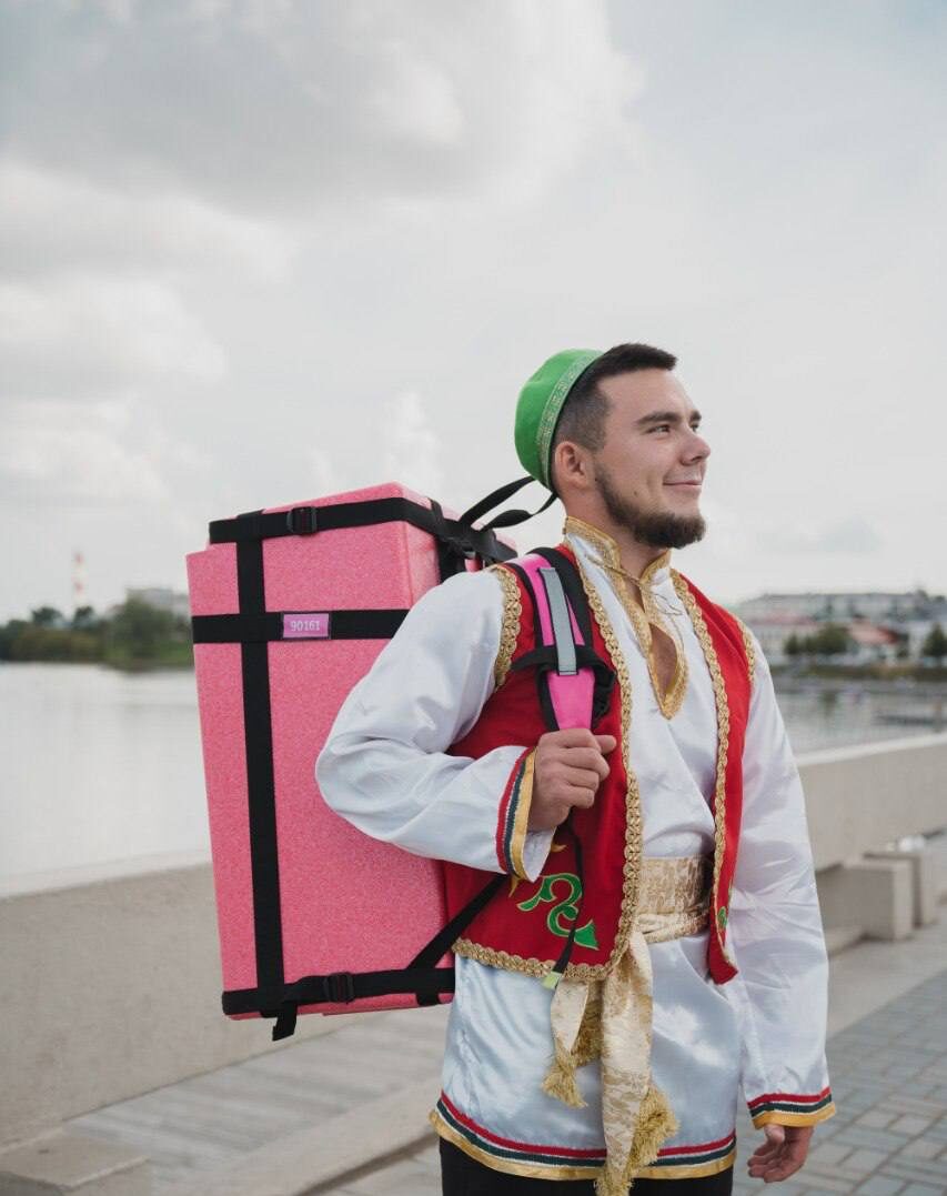 Ко Дню города и республики в Казани даже курьеры нарядились в национальные костюмы. Об этом сообщила мэрия Казани.