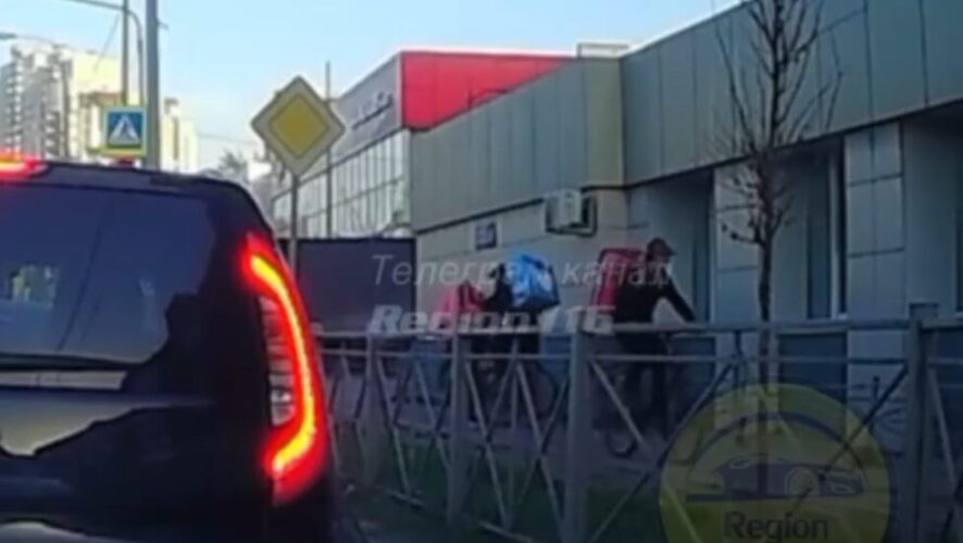 Инцидент произошел в Советском районе города на улице Аделя Кутуя. По тротуару в разных направления на велосипедах двигались 2 курьера «Самоката» и курьер «Яндекса». Один из «самокатчиков» спокойно проехал, а вот второй неожиданной столкнулся с конкурентом.