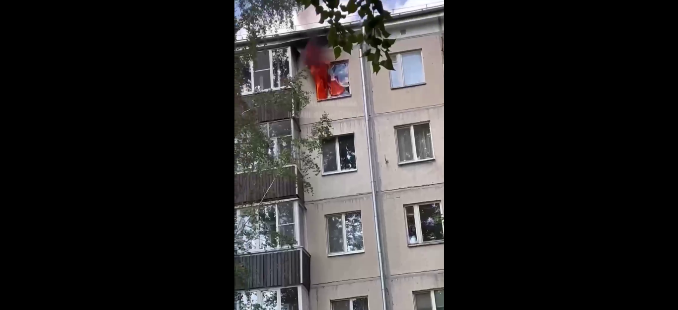 Высокий столб огня видно из окна на пятом этаже.