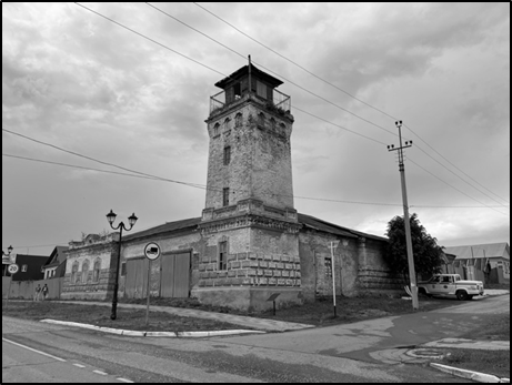 Г-образное в плане одноэтажное кирпичное здание с трехярусной пожарной каланчой представляет собой яркий пример локальной архитектурной и градостроительной доминанты. Фасады здания украшены лицевой кирпичной кладкой с квадровым рустом внизу, наличники окон имеют веерные замковые камни. Характерной особенностью является колористическое решение – натуральный цвет глиняного кирпича. Кровля здания – гладкая металлическая, печные трубы утрачены.