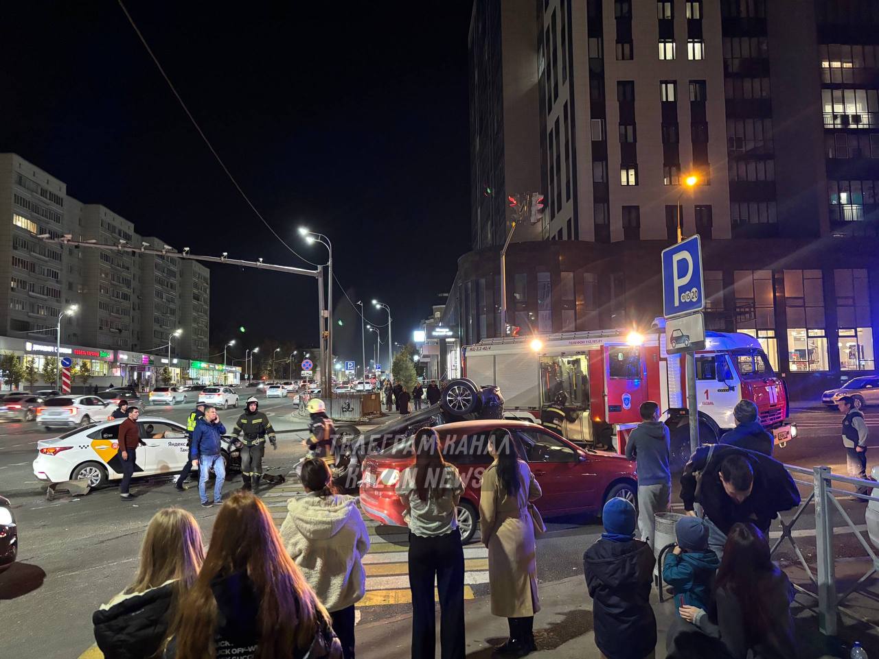 В Казани на улице Достоевского произошло серьезное дорожно-транспортное происшествие, в результате которого один из автомобилей перевернулся на бок после столкновения с такси. Об этом сообщают очевидцы в социальных сетях.
