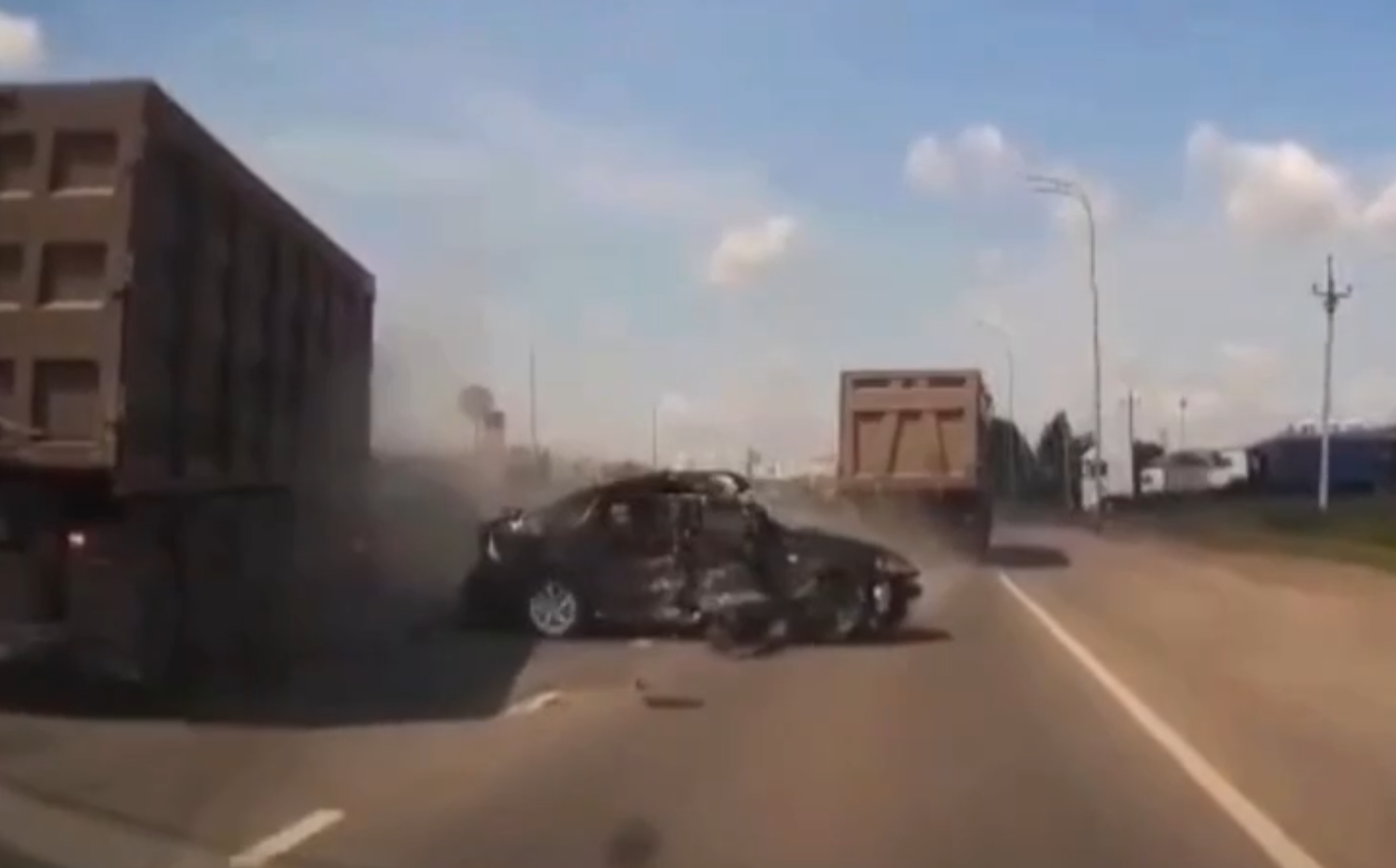 Удар пришелся в заднюю часть легковушки, которую развернуло поперек дороги и выбросило прямо на второй грузовик — тот самый, что стоял на развороте. После столкновения с его бортом машину отшвырнуло обратно к первому грузовику.