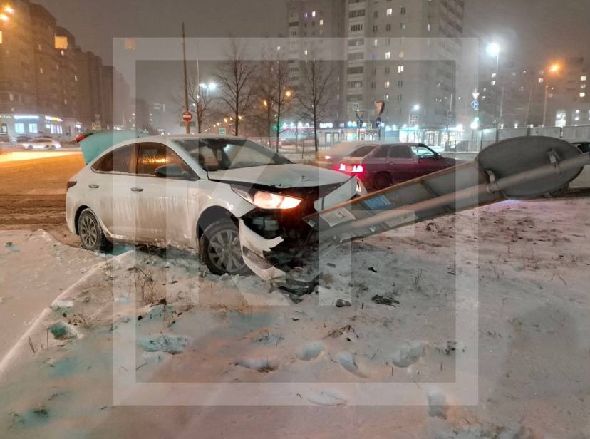 В Казани на перекрестке улиц Серова и Баруди произошло ДТП. Легковой автомобиль врезался в дорожный знак, в результате чего знак сильно погнулся.