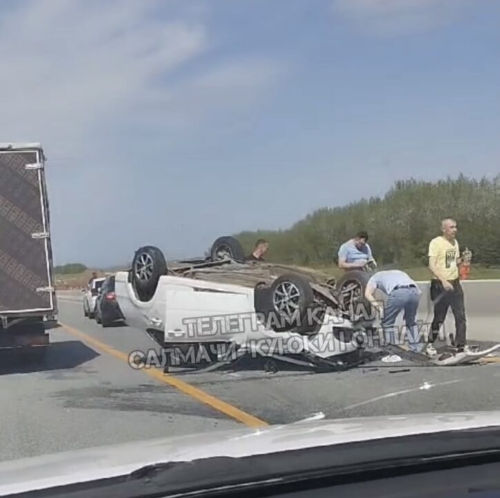 На записи видно, что на автодороге лежит на крыше белая «Лада». У легковушки оторван бампер и изуродована передняя часть кузова. Чуть поодаль на обочине сидят две женщины. Второго участника ДТП не видно.