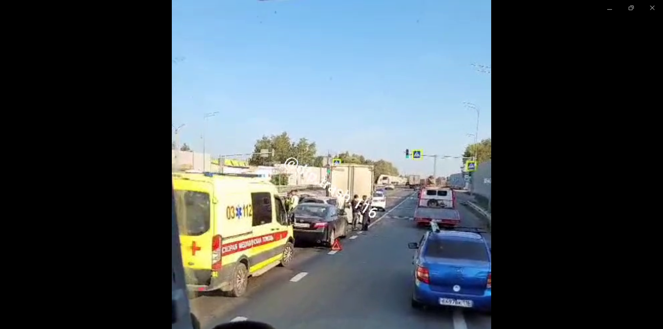 На месте видно машину скорой помощи, сколько людей пострадали в ДТП — неизвестно. Также на месте ДТП работают автоинспекторы.