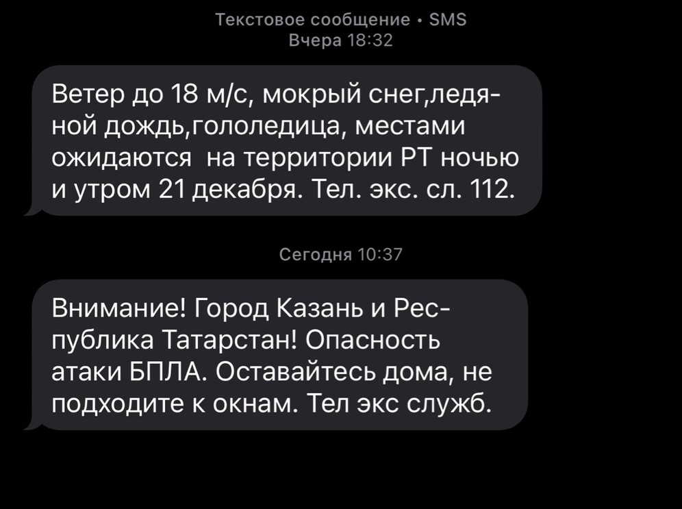 В сообщении предупреждается, что Казань и Татарстан подверглись атаке БПЛА.