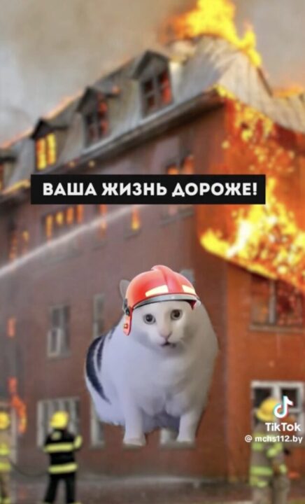 Далее мы видим распространившихся в TikTok котов, которые уже стали мемом. С помощью них сотрудники МЧС рассказывают, что нельзя поддаваться панике и возвращаться в горящее помещение за вещами.