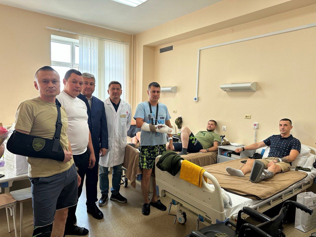 В палате вместе с Алексеем проходят лечение бойцы из Казани, Новосибирска, Кукмора и других городов. Во время беседы обсуждались бытовые условия в зоне СВО, необходимые товары для бойцов, а также вопросы поддержки семей участников спецоперации. В конце встречи Афанасьев пожелал бойцам скорейшего восстановления и вручил им подарки.