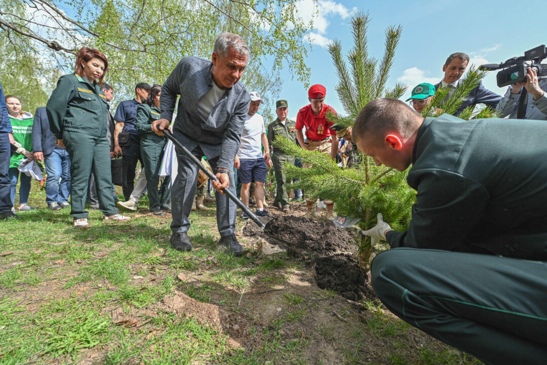 Минниханов также помог волонтерам в посадке саженцев сосны и выразил благодарность всем присутствующим.