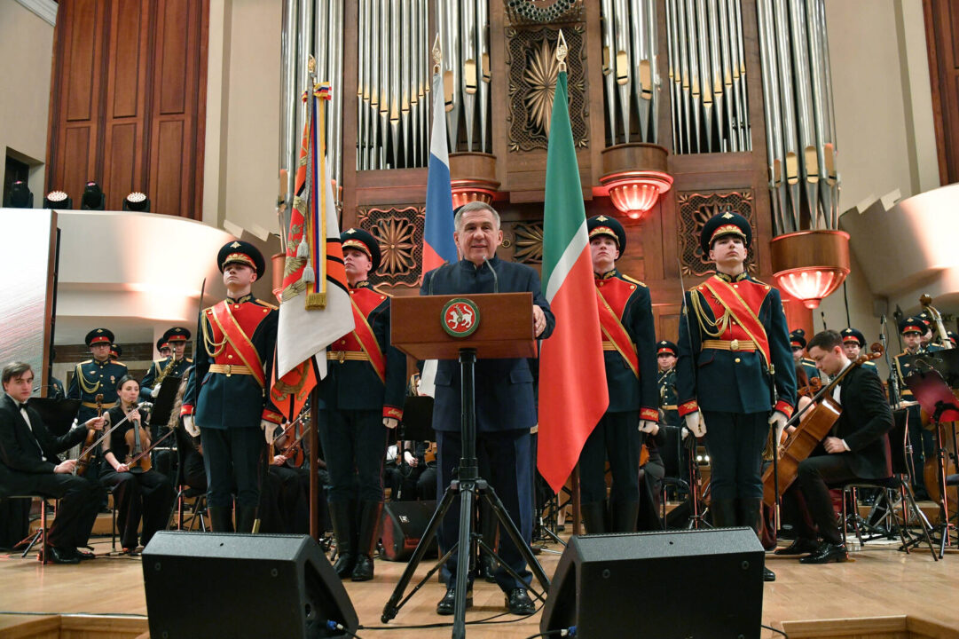 Торжество, посвященное Дню защитника Отечества, прошло в концертном зале им. С.Сайдашева. Раис Татарстана Рустам Минниханов поздравил участников специальной военной операции и вручил ордена Мужества и медали «За храбрость», «За отвагу» и «За заслуги перед Республикой Татарстан» не только участникам СВО, но и педагогам Казанского танкового училища.