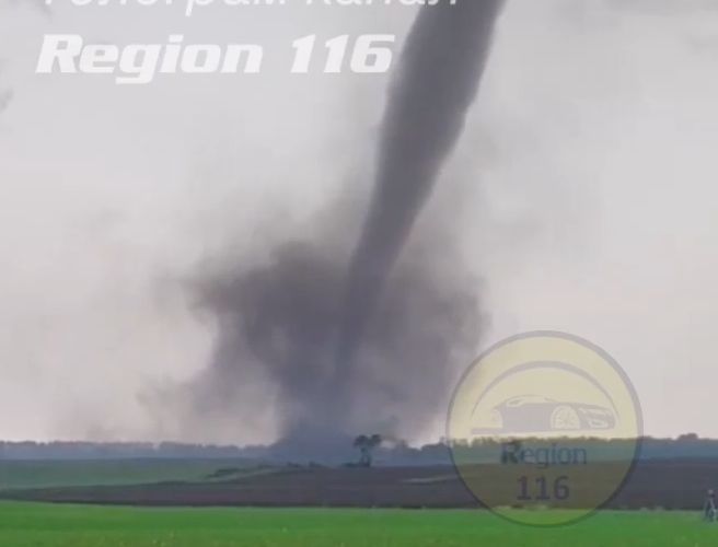 На кадрах отчетливо виден высокий темный вихрь, который поднимается от земли к облакам. Смерч выглядит как тонкий черный столб, вращающийся с огромной скоростью.