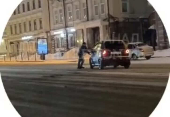 На кадрах видно, что мужчина идет по проезжей части и внезапно кидается на малолитражку. Водителю удается вывернуть и не сбить пешехода.
