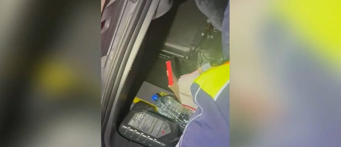 На кадрах видно, что мужчина прятал взрывные устройства в коробке из-под автомобильного компрессора. Верх коробки он прикрыл пенопластом, а саму коробку с бомбами спрятал подальше в багажник.