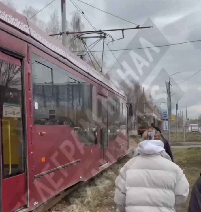 Пассажирам пришлось покинуть салон и продолжить свой путь пешком. О времени возобновления движения трамваев пока не сообщается.
