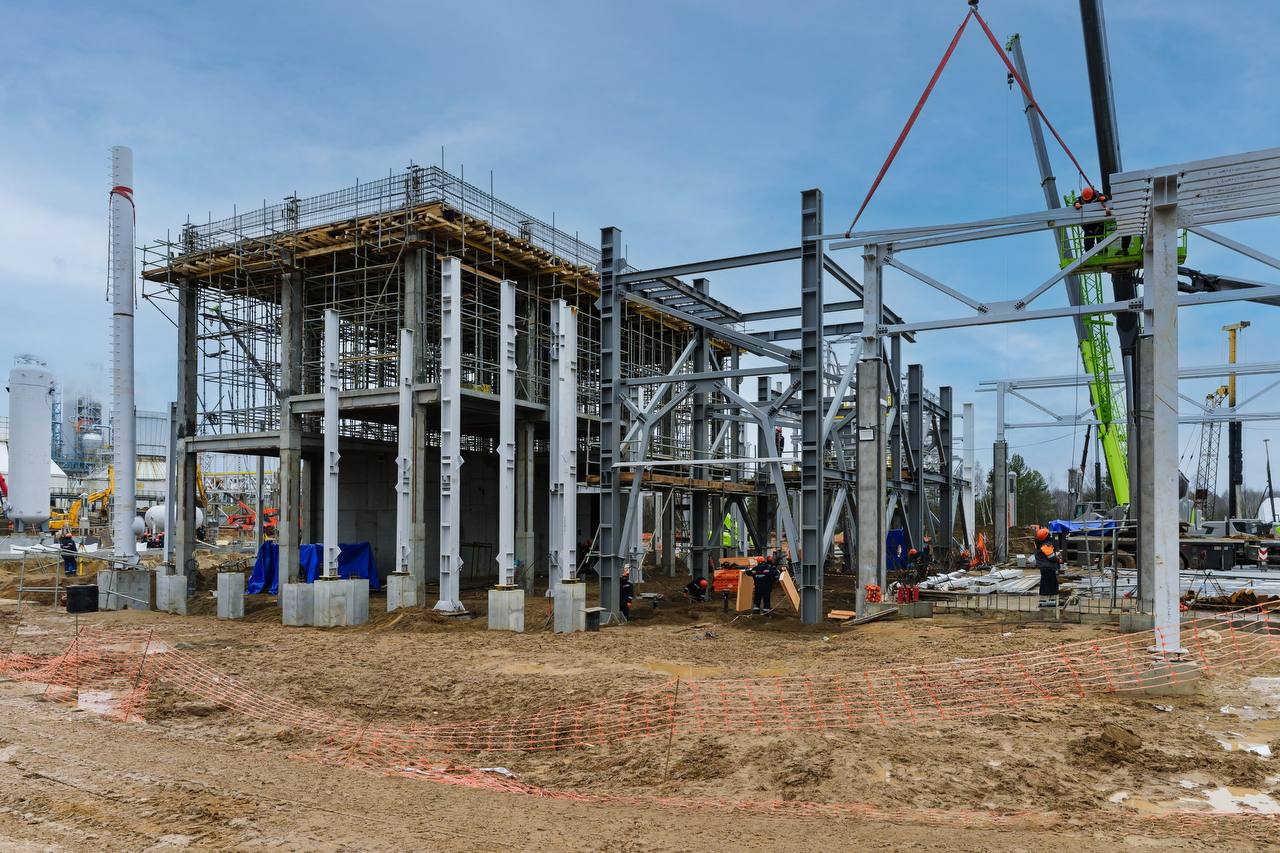 Бетонные работы выполнены на 62%, монтаж подземных коммуникаций — на 45%, монтаж металлоконструкций — на 6%. Ведется изготовление узлов технологических трубопроводов, выполняются монолитные работы и монтаж металлоконструкций здания приготовления катализаторов, сборка межцеховой эстакады. Численность строительного персонала на площадке составляет более 310 человек.
